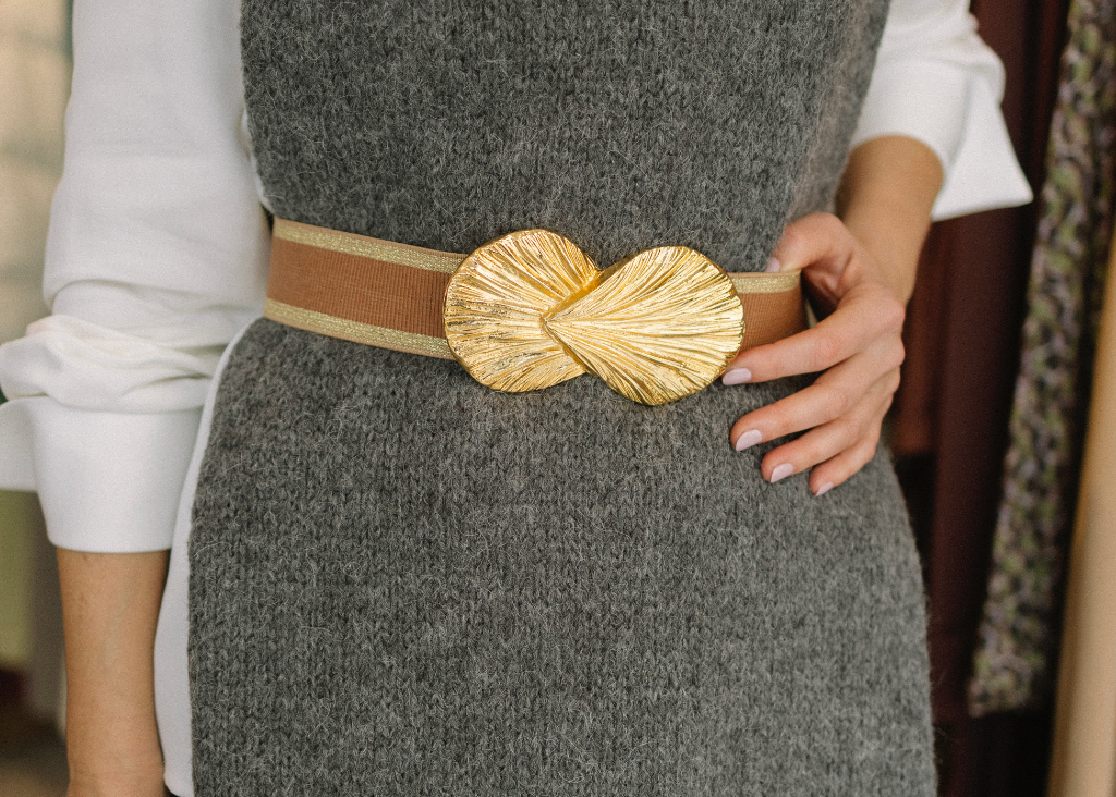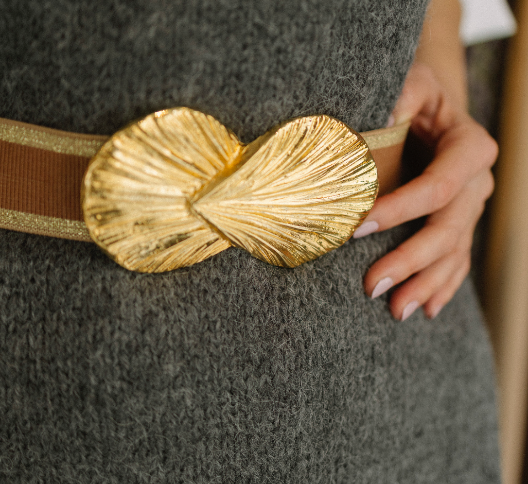 Cinturón con pieza central en forma de concha de 13 cm. Disponible en cinco tallas: XS (70 cm), S (75 cm), M (80 cm), L (85 cm) y XL (90 cm). Si necesitas otra medida, indícalo en notas al realizar la compra.