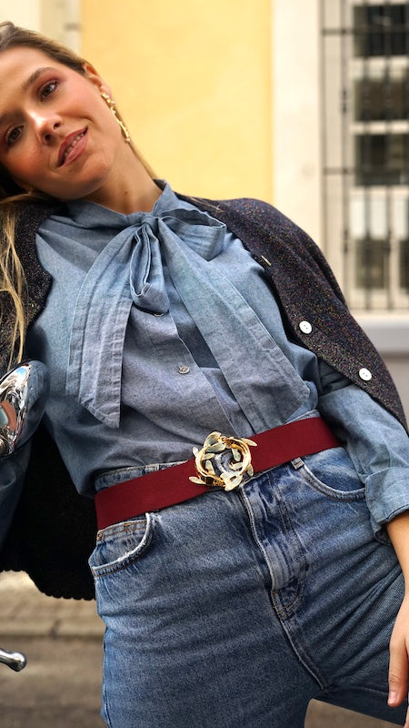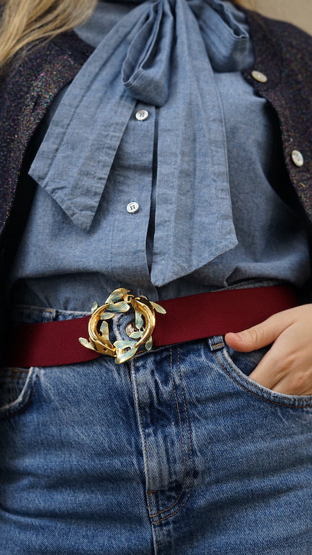 La pieza superior del Cinturón Delfín Azul, que se adhiere al centro, está hecha de zamak bañado en oro de 24 quilates y tiene una forma circular que aporta un toque adicional de sofisticación. Este Cinturón es el complemento perfecto para cualquier ocasión especial, añadiendo un toque de elegancia y glamour a cualquier conjunto. ¡Sin duda, hará que te destaques con estilo! También puedes combinarlos con nuestros Pendientes Luz.