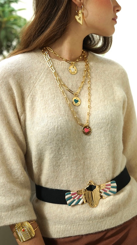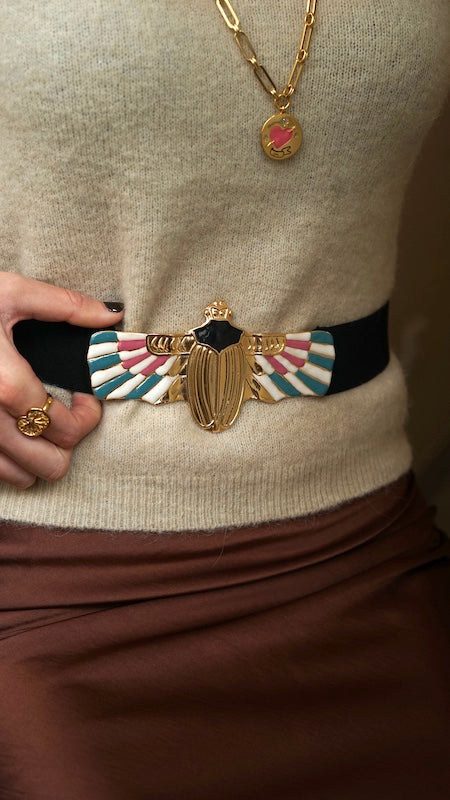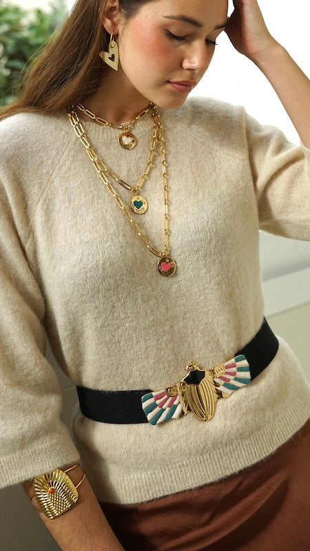 Este elegante Cinturón Escarabajo Circo una verdadera obra de arte. Con una tonalidad dorada para un acabado lujoso. Cada detalle ha sido cuidadosamente diseñado para ofrecer una joya que destaca por su belleza y calidad, haciendo que cualquier persona que lo lleve se sienta única y especial.