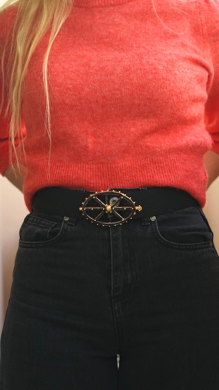 La pieza central del Cinturón Martina Negro, elaborada en zamak bañado en oro, destaca por su diseño cuidado y refinado. Perfecto para ocasiones especiales o para darle un toque único y elegante a tu atuendo diario. Para un look completo, combínalo con nuestros accesorios a juego, como los pendientes o el brazalete Martina, y añade un toque de sofisticación adicional.
