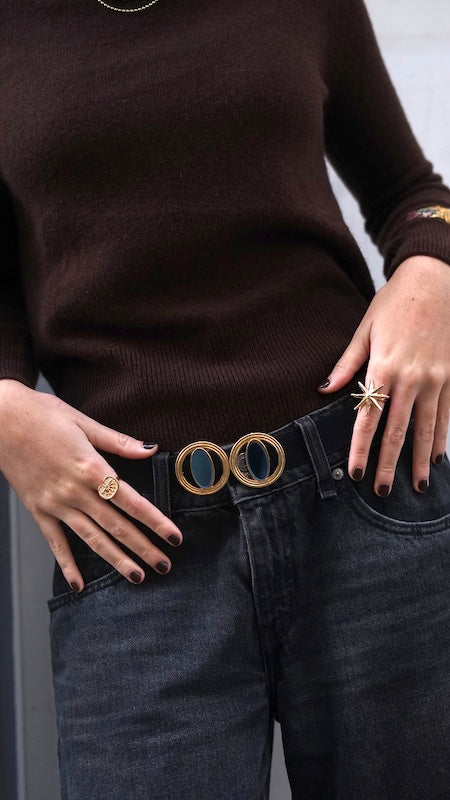 El Cinturón Óvalo es el complemento ideal para quienes buscan un equilibrio entre elegancia y modernidad. Su diseño exclusivo combina la sofisticación del metal con la ligereza del metacrilato, logrando una fusión perfecta entre brillo y versatilidad. Su cierre central en forma de óvalo, bañado en oro de 24k, añade un toque refinado que realza cualquier look, desde atuendos casuales hasta conjuntos más sofisticados para eventos especiales.