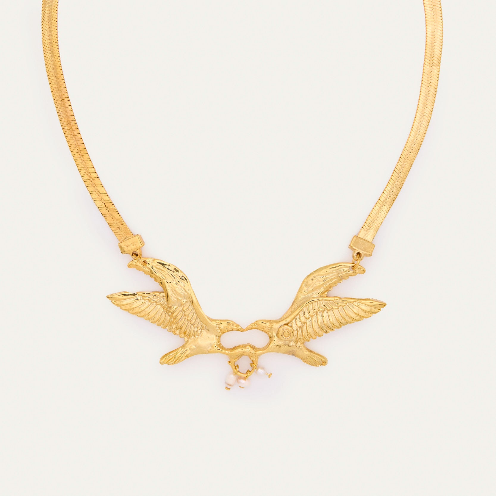 Está meticulosamente diseñado con dos majestuosas águilas en vuelo, que simbolizan la libertad y la elegancia. Las águilas están finamente detalladas, con cada pluma y cada rasgo capturados con precisión, lo que le da a este collar un aspecto realista y cautivador. Además de las impresionantes águilas, este collar también cuenta con tres perlas colgando, que añaden un toque de sofisticación y glamour.
