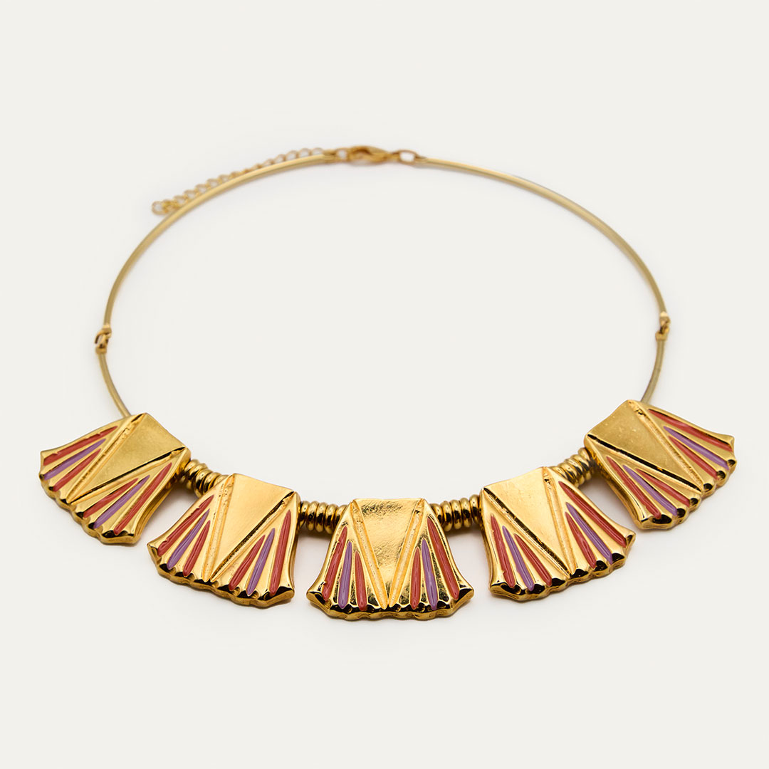 Lo que realmente hace que el collar Arancha sea único y llamativo son los hermosas piezas esmaltadas con diferentes colores que cuelgan delicadamente de él. Cada pieza es una explosión de color que agrega un toque de alegría y diversión a este elegante collar. Su diseño versátil permite que se adapte a diferentes estilos de vestimenta, ya sea para una ocasión formal o para darle un toque de glamour a un atuendo casual.