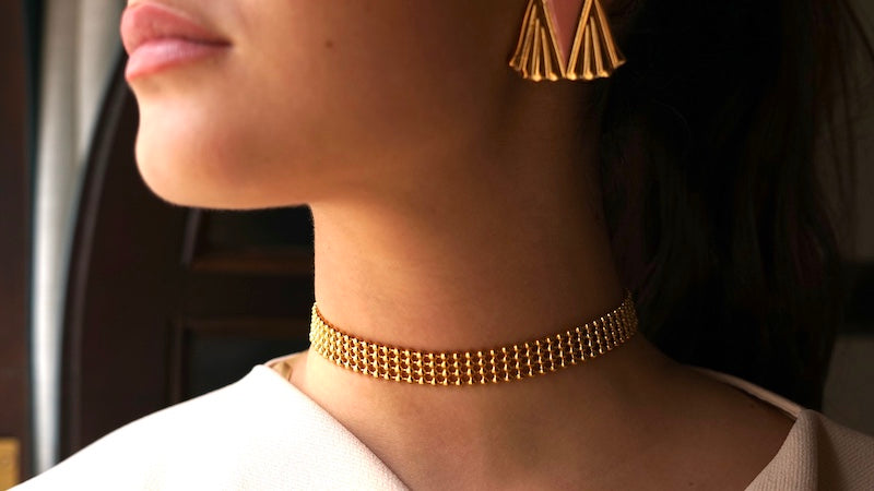 La Gargantilla Cadena combina perfectamente con el anillo Estrella Midi y los pendientes Margarita, creando un conjunto armónico y contemporáneo.