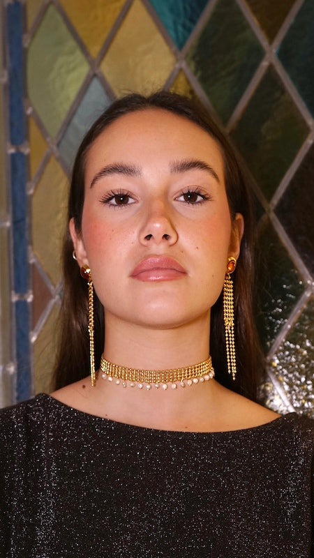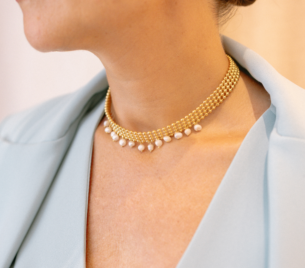 La Gargantilla Perla combina a la perfección con los pendientes Ola y el anillo Girasol, creando un conjunto armonioso y sofisticado.